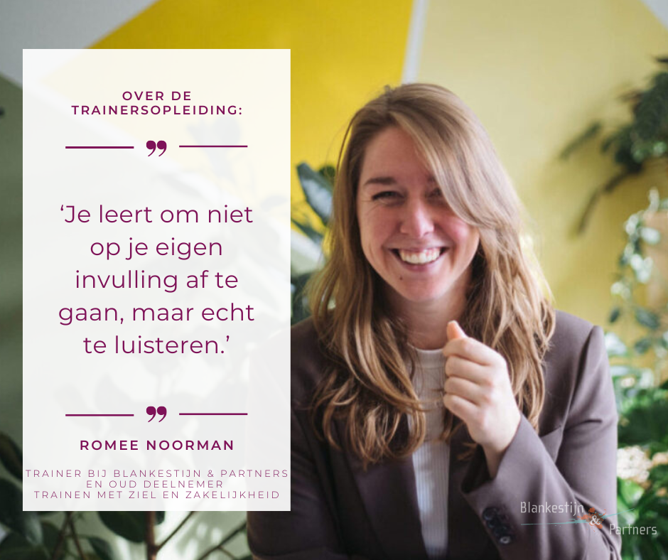 Romee Noorman volgde de Post-HBO Train de Trainer Opleiding: Trainen met Ziel en Zakelijkheid. Ze heeft inmiddels een succesvol bedrijf waarin ze zich richt op trainingen en coaching van jonge professionals die vastlopen of zich afvragen: is dit het nou? Ze helpt ze in het ontdekken van wie ze echt zijn en wat ze willen, zodat ze voluit gaan leven op een manier die bij ze past. Begin 2025 ontving ze van de NOBTRA de Young Talent Award. In dit interview spreken we onze oud-deelnemer Romee hier onder andere over.